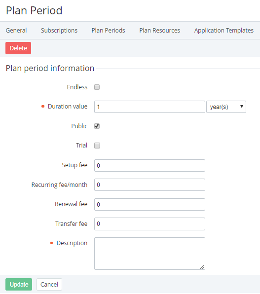 Changes in the Duration value fields and the Endless, Public, Trial checkboxes of a Plan Period for an existing Plan with the attribute Delegated = No are applied to all delegated Plans on all downstream Reseller levels.