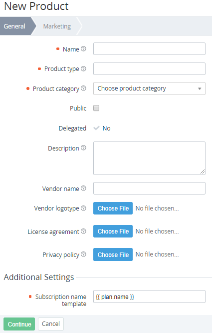 plan.name, and all Subscription names, excluding Subscription for Domains and Certificates, equal the names of corresponding Plans (see Default names of Subscriptions and Entry Points and Entry point configuration).- Click Continue. The Marketing tab is displayed.