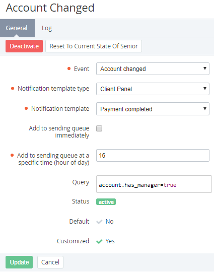 - Click Reset to Current State of Senior. The Event Handler is reset to the state of the corresponding Notification Template of the upline Reseller. The Customized attribute is set to No. The status of the Even Handler does not change.