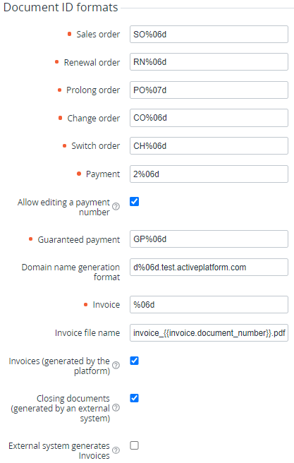 Invoices (generated by the platform) — if the checkbox is selected, the Invoices section is displayed in the Customer Control Panel (see Управление Актами).