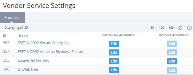 - On the Navigation Bar go to Vendor Service Settings (see Navigation). The list of products received from Vendor Portal is displayed.