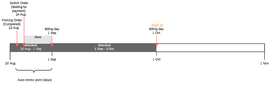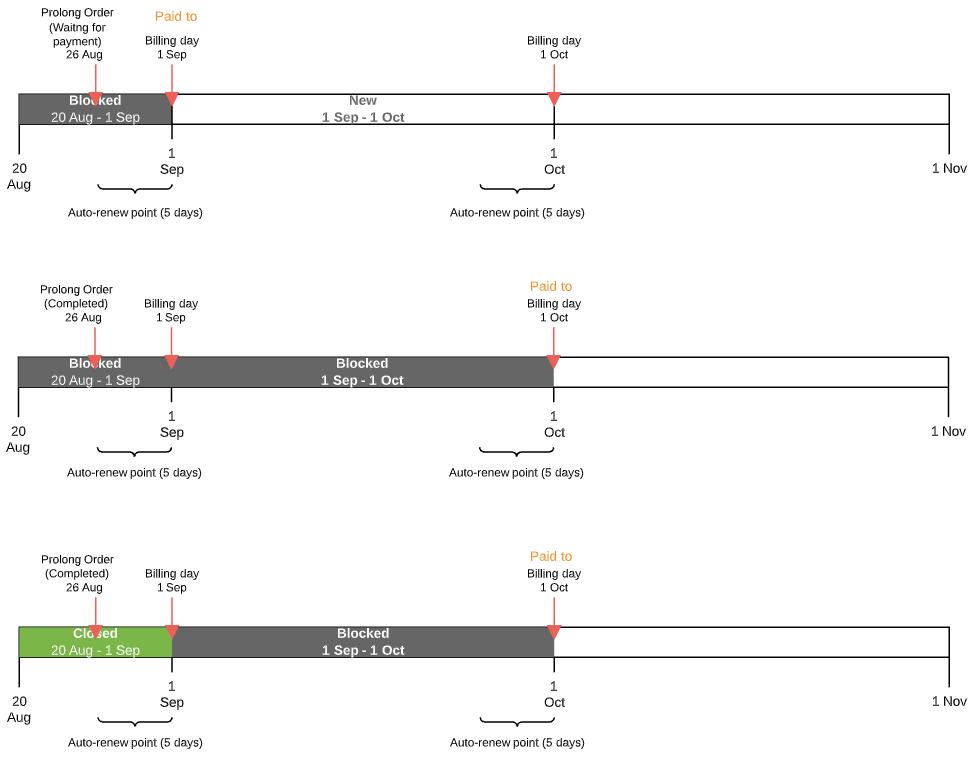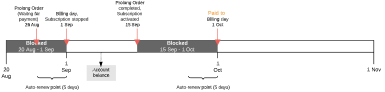 - If the Prolong Order is created on the Paid to date or later but the number of days to the next Billing day is less than or equal to Auto-renew point (days) — from the current day to the nearest date among the next Billing period end and the Subscription expiration date. Several Charges are created in the New status.