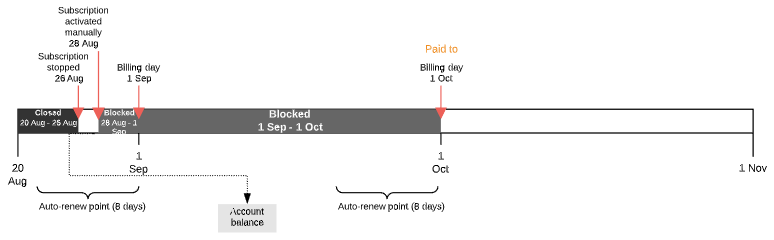 - If there are not enough funds on the Account balance, the Subscription is stopped. To activate the Subscription, a customer need to pay for the Renewal Order.
