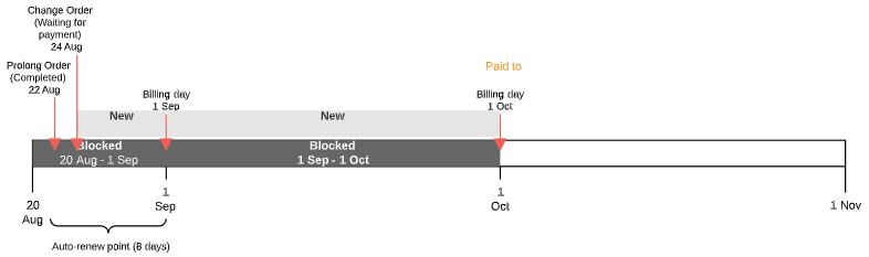 After completing the payment linked to the Prolong Order, the next Billing period Charge gets the Blocked status. The Paid to date is set equal to the next Billing day.