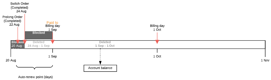 - If the Prolong Order is created on the Paid to date or later but the number of days to the next Billing day is greater than Auto-renew point (days) — from the current day to the nearest date among the current Billing period end and the Subscription expiration date. One Charge is created in the New status.