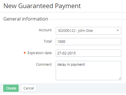 - In the Expiration date field, define the date when the guaranteed payment expires. After Expiration date, the Account balance will be reduced by the Total amount.