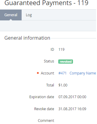 - Revoked — the Guaranteed Payment has been revoked manually or automatically because of Account balance top-up exceeding or equal to the amount of the Guaranteed Payment (see Revoking a Guaranteed Payment).
