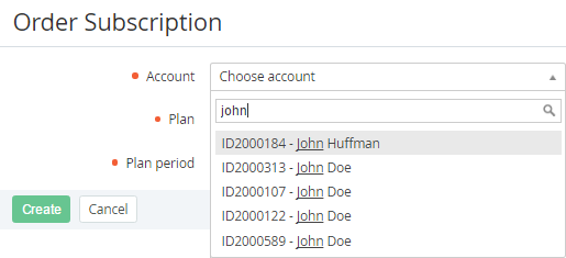 Pages for creating and updating system objects contain drop-down lists with the search function. For example, the Account list on the Order Subscription page (see Ordering a Subscription at the Plan prices) has the search function.