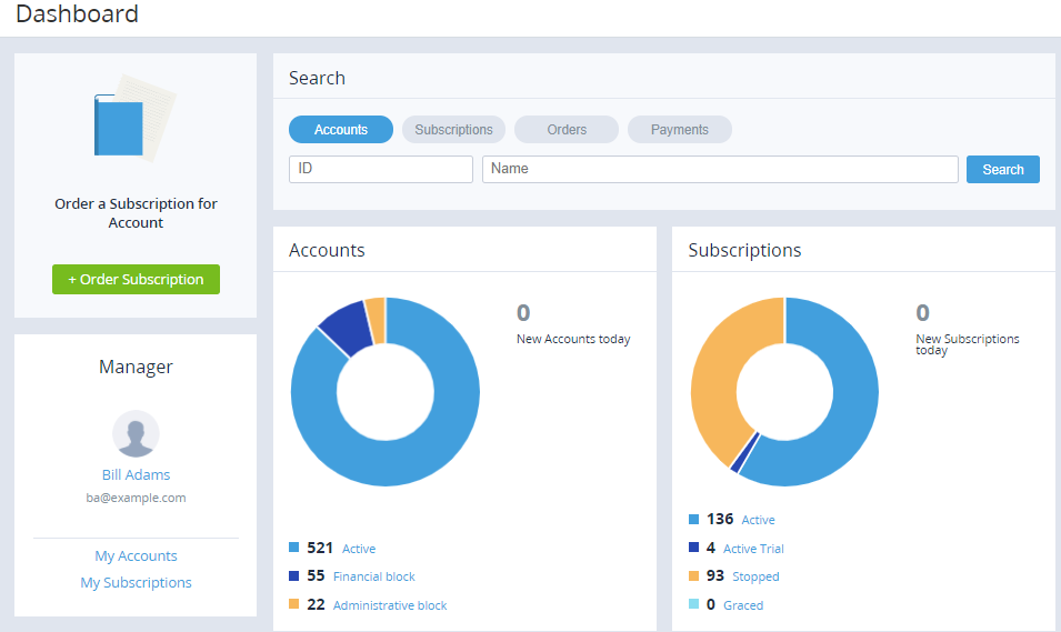 - A block with information about the current Manager. Click My Accounts or My Subscriptions to view the Accounts or Subscriptions assigned to the Manager, respectively.