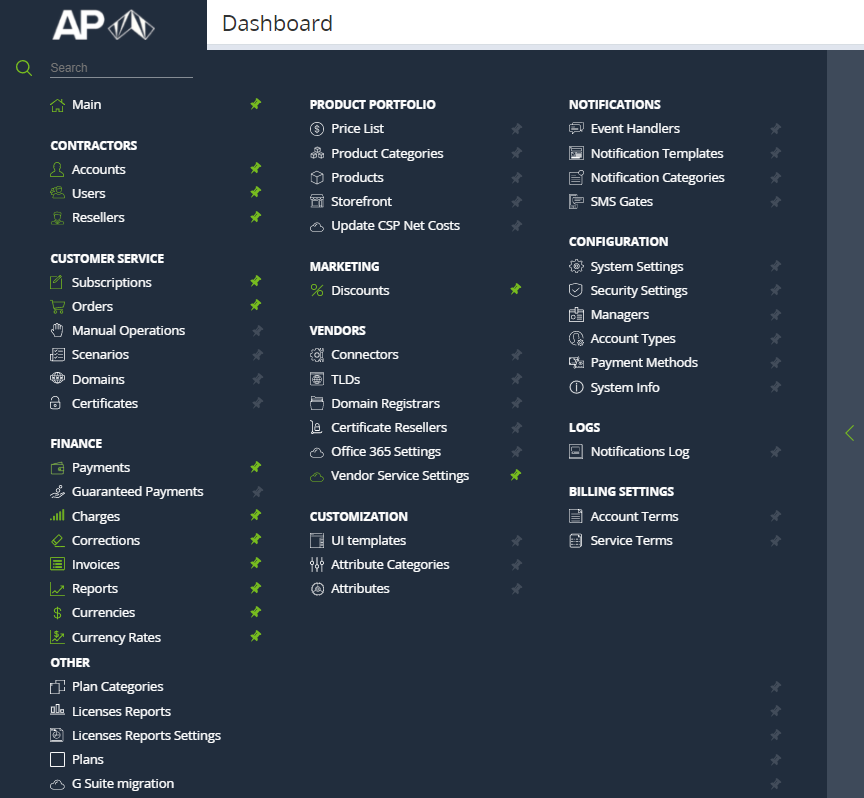 To pin a section, click next to the section name. The button becomes green, and the corresponding section appears in the standard and compact menu.