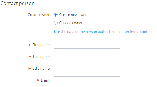 To create a new User, select Create owner and enter the name and email of the User. To copy contract person's data for the new Owner, click Use the data of the person authorized to enter into a contract.