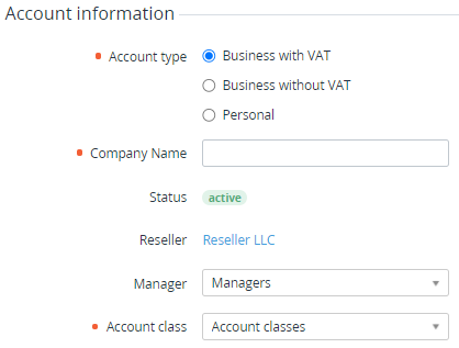 Optionally, in the Manager list, select the personal Manager for the Account. All active Managers with the Sales person role of the Reseller are available in the list (see Viewing the List of Managers). By default, the Manager is not set.