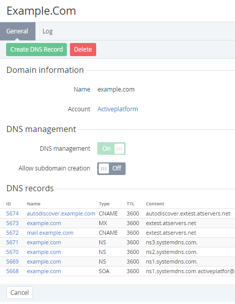 You see domain's details page, which consists of following tabs:- General — general domain information (for internal domains the expiration and registration dates are displays), DNS management options and DNS records;
