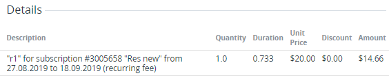 The amount of the Order and the amounts of the Charges are rounded off to two decimal places. When a discount is applied, this may lead to a discrepancy between the amount of the Order and the amounts of the Charges for the Subscription. To avoid this, rounding off and applying of a discount to the amounts of the Order and Charges is performed according to a special algorithm (see Specifics of Orders and Charges amounts calculation and rounding when a discount is applied).- Netcost: