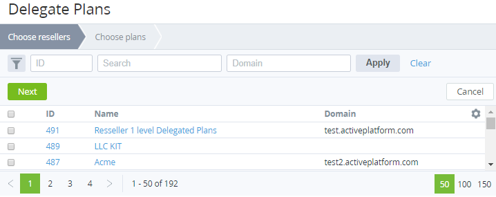 - On the Toolbar, click Delegate Plans. The Choose resellers step of the Plan delegation wizard is displayed.