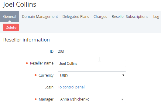 You see Reseller's details page, which consists of the following tabs:- General — Reseller's general information and options for managing Resellers (see Viewing and updating Reseller general information).
