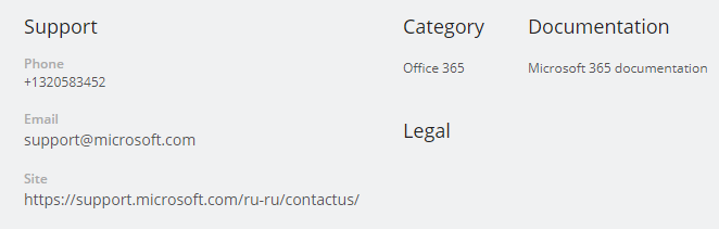 - The Support section displays contact information of Product technical support. It includes the following elements: