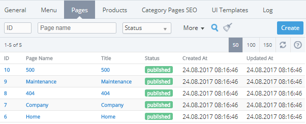 - Toolbar allows to filter Information pages list and to search Information pages by following parameters: ID, Page Name, Status, Created at, Updated at.