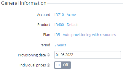 - On the page with the Plan, Plan period, Subscription, and Resources information, in the General information group, in the Provisioning date field, select the required date between the current date and the current day + 15 days.