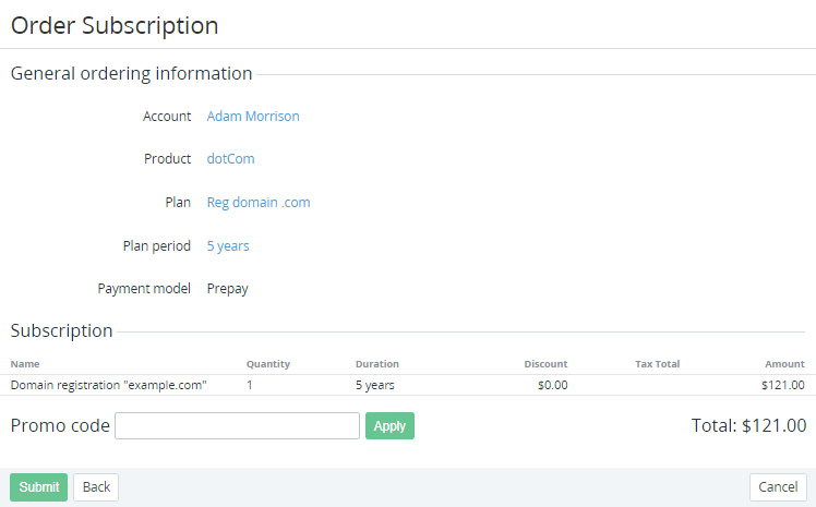 - Look through the order details and click Submit. The Domain Subscription will be ordered.