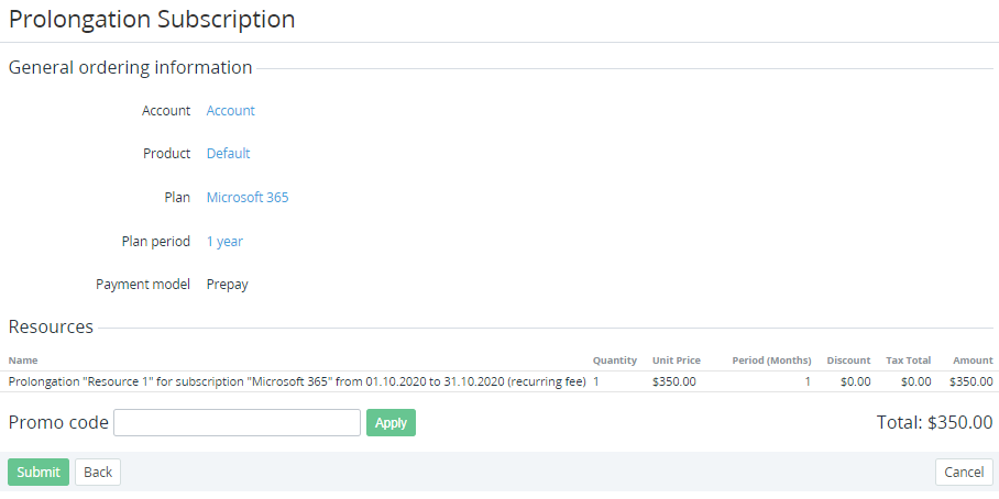 If the Subscription does not have the Prolong Order in the Waiting for payment or Waiting for provisioning status, the page of a new Prolong Order is displayed.
