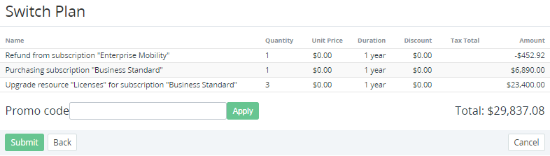 Click Switch Plan. The page with information about the Order and the Resources amount is displayed similar to ordering a new Subscription (see Ordering a Subscription at the Plan prices).