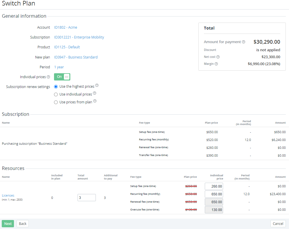 Use individual prices — the Subscription fees and the Resources fees are used at current individual prices.