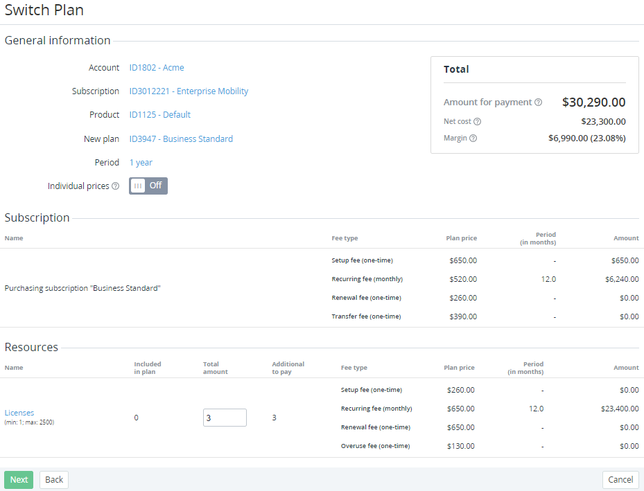 Changing the Resources amount is not available for switchable Plans with the Pay in full and License-based (Monthly) billing types.