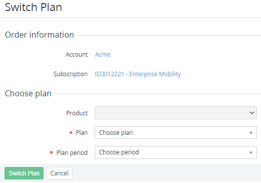 Switching a Plan allows changing the Plan of an active Subscription to one of the dedicated Plans if they are configured as Switchable (see Managing Switchable Plans). The period when switching the Plan is available for a Subscription is set in its Manual switch point (days) parameter (see Viewing and updating Subscription's details). The default value is inherited from the linked Service Term (see Creating a Service Term). For Subscriptions with the CSP annual and Monthly Commitment billing types, switching the Plan has its specifics (see Delayed Switch plan Order below).