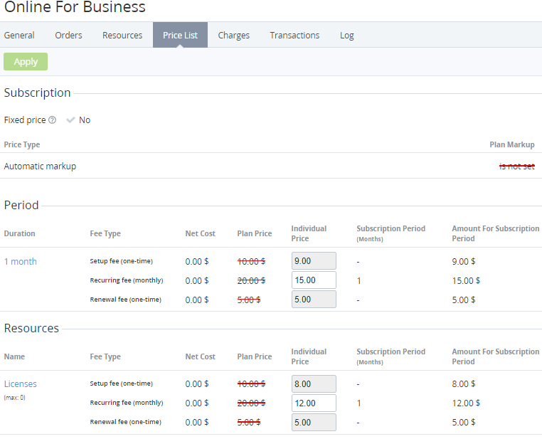 On the Subscription page, it is possible to view all prices applied to the Subscription, including the automatic markup (see Price List), Plan Periods and Plan Resources prices. For Subscriptions ordered at theindividual prices (see Ordering a Subscription at the individual prices), it is also possible to update theindividual prices of the Plan Periods and Plan Resources.