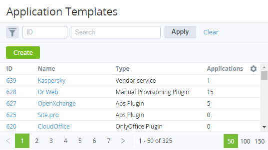 • Type — Plugin or APS package used for creating the Application Template (see Creating Application Templates).