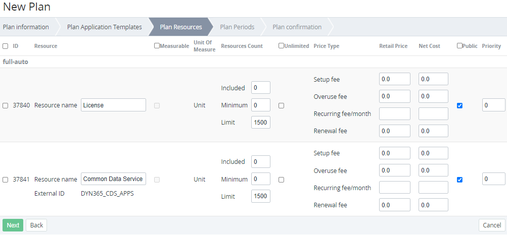In the rows with the Resources to be added to a Plan, select the checkboxes next to the Resource ID. On the following steps, it will be required to fill in all available fields for these Resources only.