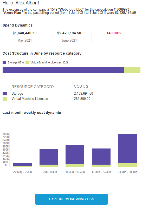 The Event occurs independently for every Subscription of an Account. On the New Notification Template page, in the Additional Settings group, in the To field, it is possible to use the {{owner.email}} Placeholder to send a Notification to the Owner of an Account. For the Event, a particular preformatted Notification Template with data per Resource category can be used for Microsoft Azure Plan and Microsoft Azure Subscriptions: |