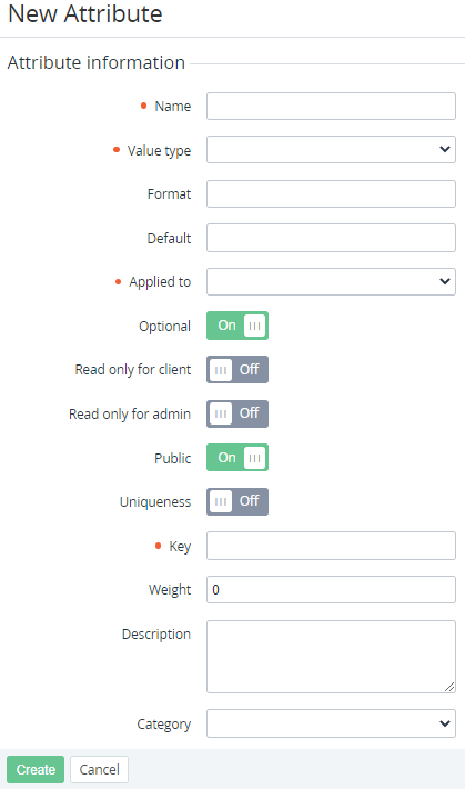 - To make this Attribute visible only for Managers in the Operator Control Panel in which this Attribute was created, turn Off the Public switch. By default, the Public switch is On, and the Attribute is visible for Managers and Accounts of the current and all downstream Resellers.