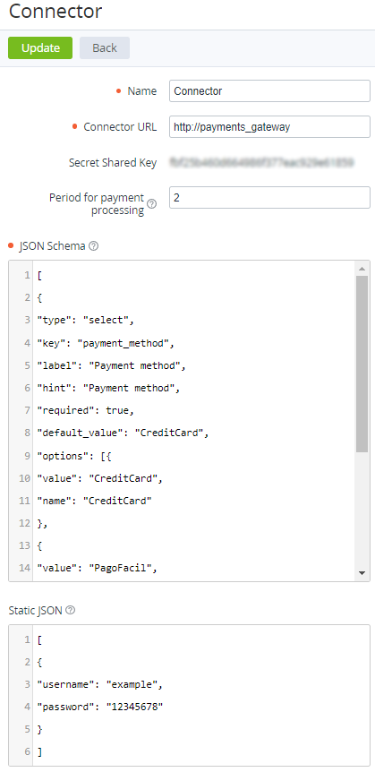 - The JSON Schema field is not available for changing if the Payment gateway connector is used by any Payment Method (see Instances in Viewing the list of Payment gateway connectors)..