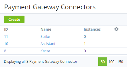 - Instances — number of created Payment Methods based on the Payment gateway connector among all levels of Resellers (see Creating a Payment Method).