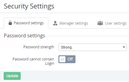 The password settings are used for configuring the requirements to the password strength in the Operator Control Panel and Customer Control Panel.