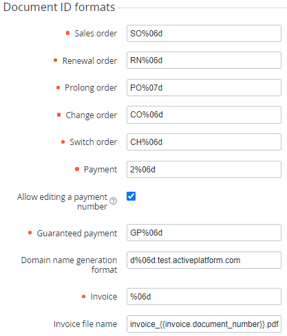 Document ID formats — templates used for numbers of various documents in ActivePlatform. Any document number must include the %N mask, where N — is a number of characters (minimum 6), and may include letters (for example, SO — Sales Order, RN — Renewal Order), dashes and placeholders.