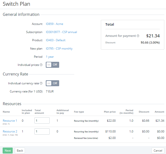 Changing the resource quantity is not available for switchable plans with the Pay in full and License-based (Monthly) billing types.