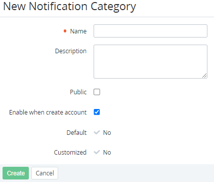5. To make the notification category available for configuring in the Customer Control Panel (see Notification settings), select the Public checkbox.