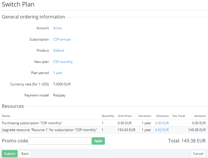 Click Switch Plan. The page with information about the order and the resource quantity is displayed, similar to ordering a new subscription (see Ordering a subscription at the plan prices).