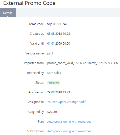 Information in the Assigned at, Assigned to, Assigned by, Plan, and Subscription fields is displayed only for promo codes in the Assigned status.