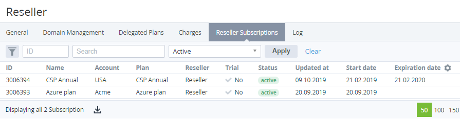 3. Go to the Reseller Subscriptions tab. The list of subscriptions is displayed.