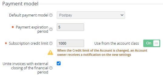 - Unite invoices with external closing of the financial period — the default value is inherited from the account class (see Creating an account class). When the checkbox is selected, instead of individual invoices, one joined invoice is issued for subscriptions of an account when all the following conditions are met: