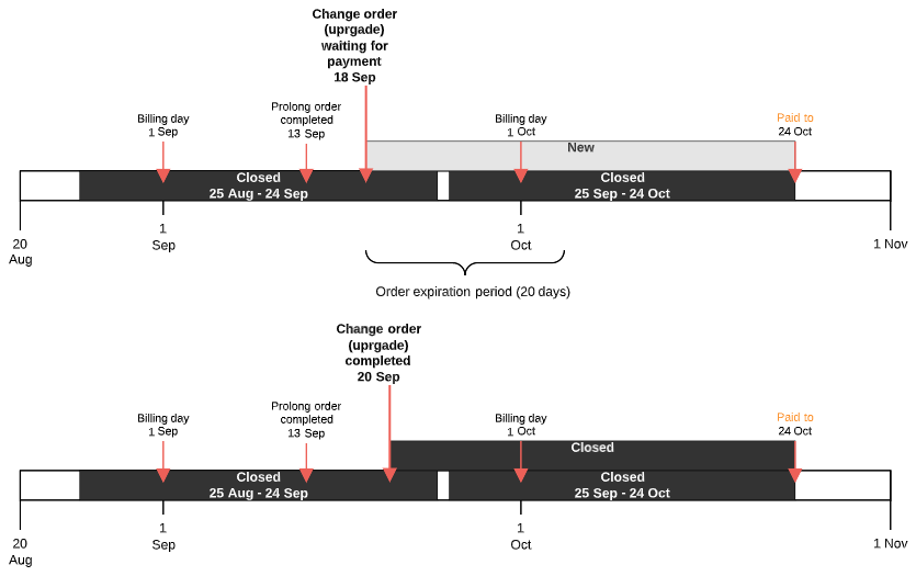 2. The linked payment in the Waiting for payment status with the amount required for the upgraded resources from the date when the change order was created till the Paid to date.