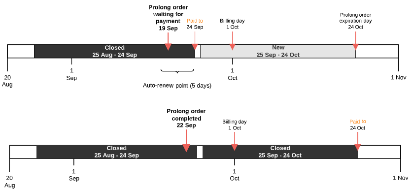 1. A prolong order is created before the specified number of days to the Paid to date. The number of days is specified in the Auto-renew point (days) parameter of the subscription.