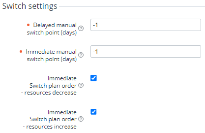 If you need to prohibit increasing the quantity of resources in an immediate switch plan order, clear the Immediate Switch plan order - resources increase checkbox. By default, the checkbox is selected, and increasing the quantity of resources in an immediate switch plan order is allowed.
