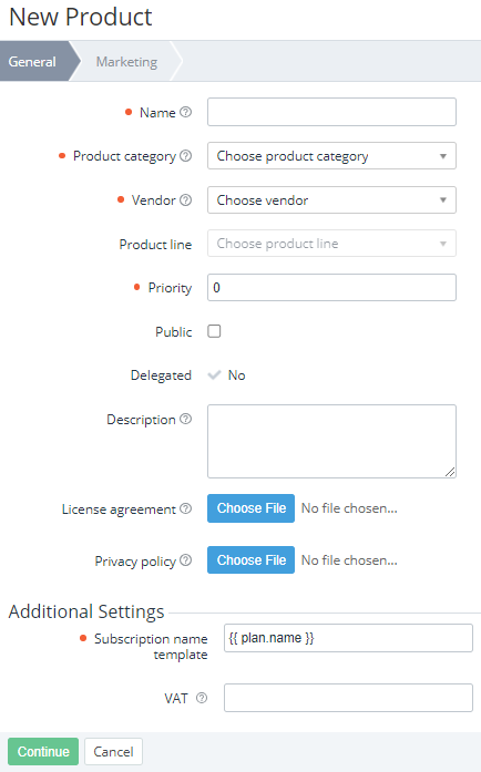 {{ plan.name }}, use{{ subscription.name }}. Renaming of an existing subscription is always available to customers, regardless of the subscription name template.Skip the VAT field. It is not used in the current version of the platform.