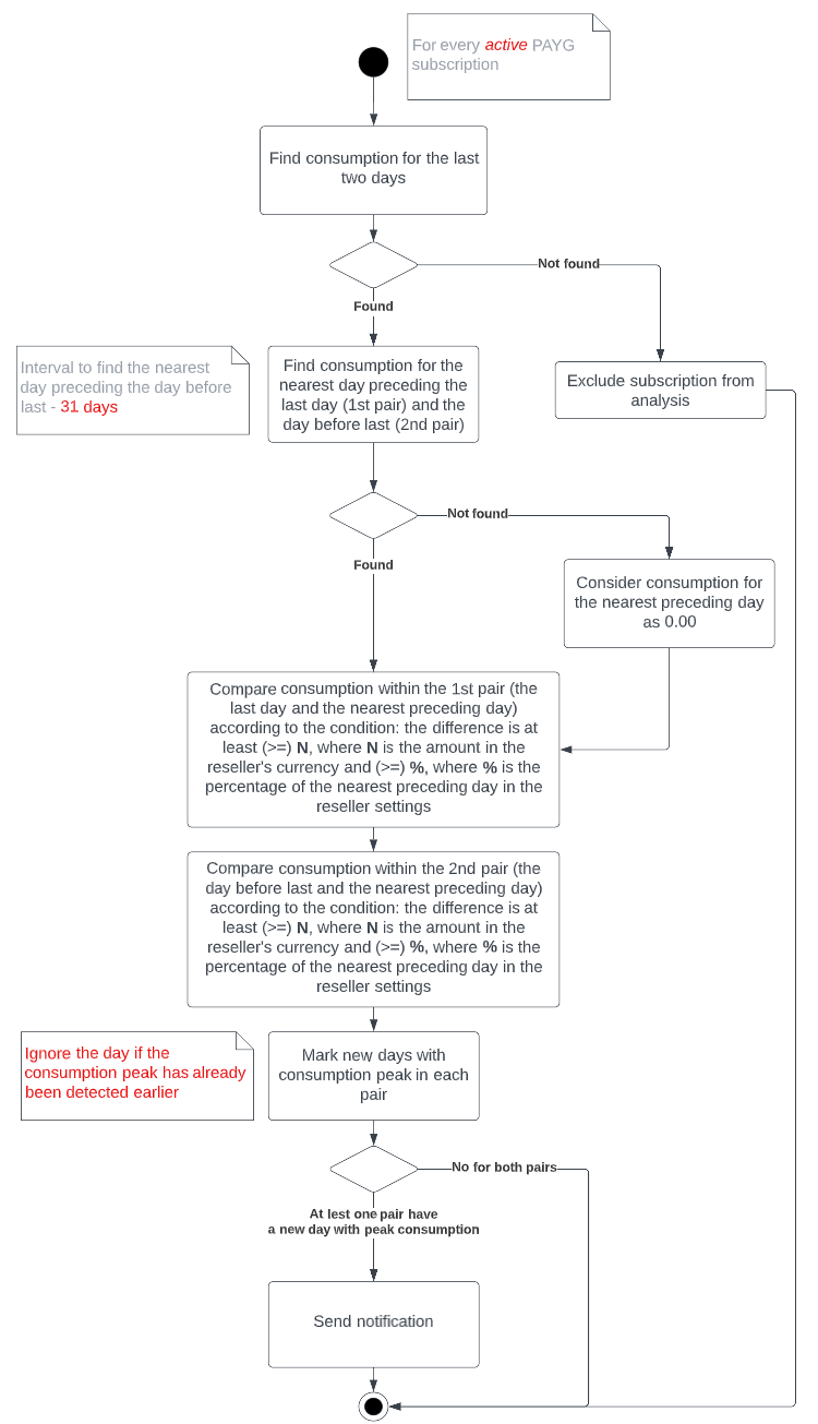 | Unexpected consumption increase detection | Occurs when the consumption change in day-to-day comparison for a subscription with the Pay as you go billing type reaches or exceeds a threshold. If two thresholds are set, the event occurs when the consumption change equals or exceeds both. The thresholds are set in the system settings and applied to all subscriptions (see Monitoring consumption anomalies for PAYG subscriptions in General system settings). |