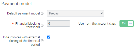 - Unite invoices with external closing of the financial period — the default value is inherited from the account class (see Creating an account class). When the checkbox is selected, instead of individual invoices, one joined invoice is issued for subscriptions of an account when all the following conditions are met: